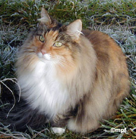 | Nachka est notre première Norvégienne. Son grand gabarit (5.5 kg à 4 ans), son superbe regard vert, son excellent type, et son tempérament de "Show Cat" lui ont valu de remporter de grands succès en expositions! Nachka est un "amour de chat", très câline et bavarde... Son activité préférée: faire des câlins au creux du lit le matin au réveil... Elle est la mère de notre étalon, Pirate de Laïloken et de sa soeur qui lui ressemble énormément, Ushka de Laïloken. Elle a été stérilisée en juillet 2003, et a commencé une nouvelle et brillante carrière d''expo en 2004 en tant que neutre et vétéran. En 2004 et 2005, elle a remporté de nombreux succès et contribué à aider les jeunes à rester zen lors des expositions! Nachka nous a quittés le 30 avril 2007, des suites d'un fulgurant cancer osseux. |
