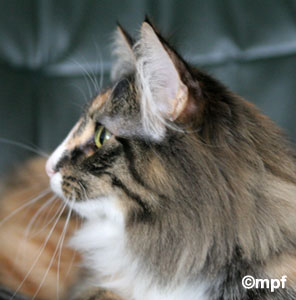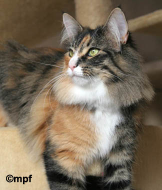 SC F* Forest Cat Belle black mackerell tortie tabby et blanc NFO f 09 23, née le 13/08/2006 éleveur : Muriel Berman HCM: négative (janvier 2008) GSD4: négative Pedigree Album photo portée 27, née le 29/07/2008 |