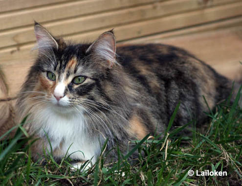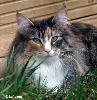 | Belle... est un vrai coup de coeur... D'abord par ses origines: fille de Arleen de Laïloken, petite fille de Ushka de Laïloken et Korsaire av Skara Brae, arrière-petite fille de Nachka.... Son côté maternel rassemble quelques uns de nos plus beaux chats. Quant à son père Unikum du Valldall, il est issu de deux splendides lignées danoises. Puis un type superbe... que dire?? Look , fourrure, magnifique profil, superbes oreilles à plumets... et pour finir un caractère.... d'adorable chipie, tellement semblable à celui de sa mère et de sa grand mère. Belle s'est aussi révélée une meveilleuse maman, en plus d'être une vraie show-cat. Bref: une recrue de choc et de charme!!! Mille mercis à Muriel et José Berman, qui m'ont confié leur petite merveille! |