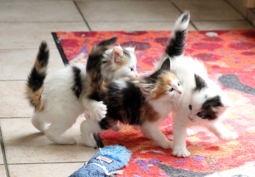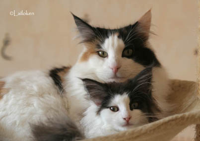 Our kittens are raised in family with me and all the cats breeding babies together. They don't go outside, but can go wherever they want in the house, are never kept closed or alone. EACH kitten leaving our home will always be one of our beloved babies, and we'll keep contacts with the new owners to have some news of our little cats, all their life long! |