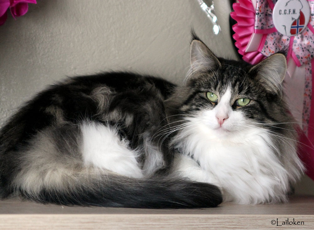 Jiki est une présence calme et ronronnante, qui adore le jardin et flaner dans les fleurs. Malheureusement, après une expérience un peu traumatisante en expo, Jikita nous a fait comprendre que ce n'était pas pour elle, et elle restera donc tranquillement à la maison , après avoir obtenu son certificat de conformité à Paris.