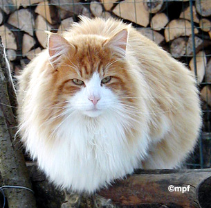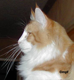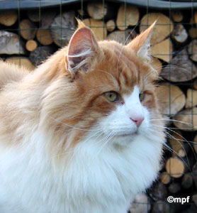 | Korsaire est notre mâle d'élevage aux origines suédoises, arrivé à la maison depuis la Suisse en 2002 grâce à l'amitié qui me lie à Sarah - chatterie av Skara Brae. Turbulent et adorable chaton au charme dévastateur (il a conquis nombre de juges lors d'expositions!!), Korsaire s'est mué en un mâle très costaud, à la fourrure imposante, avec toujours ce look et ce charisme extraordinaires hérités de sa mère Gipsy Queen. Korsaire n'est pas très loin de mon idéal absolu! Sa tête au triangle parfait et ses grandes oreilles à plumets placées bien dans le prolongement, son look et son caractère ronronnant sont ses atouts majeurs... entre autres. D'autant plus que Korsaire les donne quasi systématiquement à ses chatons. Son tempérament un peu hyperactif ne l'empêche pas d'apprécier les séances de câlins sur les genoux qui peuvent durer une heure! TRES bavard, il communique par roucoulades permanentes. Sa compagne attitrée est Angel, la seule à supporter 24h/24 son activité non stop, et autorisée à partager son coussin! |