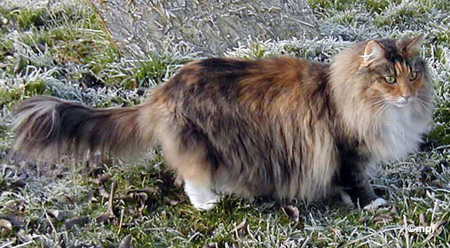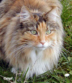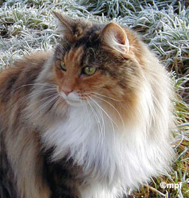 | Nachka est notre première Norvégienne. Son grand gabarit (5.5 kg à 4 ans), son superbe regard vert, son excellent type, et son tempérament de "Show Cat" lui ont valu de remporter de grands succès en expositions! Nachka est un "amour de chat", très câline et bavarde... Son activité préférée: faire des câlins au creux du lit le matin au réveil... Elle est la mère de notre étalon, Pirate de Laïloken et de sa soeur qui lui ressemble énormément, Ushka de Laïloken. Elle a été stérilisée en juillet 2003, et a commencé une nouvelle et brillante carrière d''expo en 2004 en tant que neutre et vétéran. En 2004 et 2005, elle a remporté de nombreux succès et contribué à aider les jeunes à rester zen lors des expositions! Nachka nous a quittés le 30 avril 2007, des suites d'un fulgurant cancer osseux. |