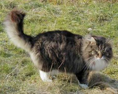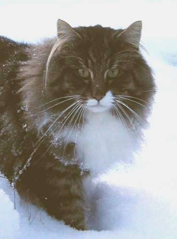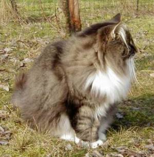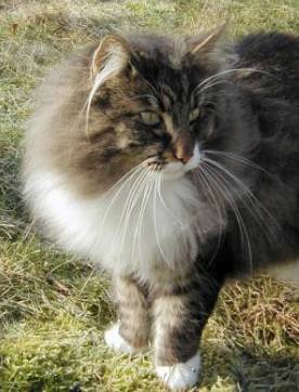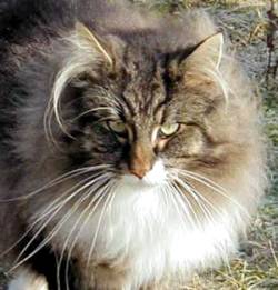 | Pirate est le premier chat né dans l'élevage que nous avons gardé pour perpétuer la lignée de Nachka, et je ne regrette pas ce choix!! Pirate est un mâle très solide avec un profil parfaitement droit et long, un bon menton, une superbe qualité de poil avec de longs plumets sortant des oreilles. Il a ce look sauvage que cherchons absolument à garder chez nos Norvégiens! Pirate nous a donné de très beaux chatons, et a assuré la pérennité de sa lignée via certains de ses descendants qui nous comblent de fierté, qu'il s'agisse de IC Scarlett et IC Sweet Angel de Laïloken, Vanille et Vixen de Laïloken, GIC Solskinn et Ch. Talisman du Domaine d'Asgard, Ch. Tulipe et IC Teddy Bear du Valldall, Lorina av Skara Brae ou encore Uranie de la Toison du Nord. Tous ces chats représentent très dignement leur père en expositions et lui assurent une belle descendance. Pirate a été castré en juin 2004. Il va désormais pouvoir couler une heureuse retraite au côté de sa mère, de sa soeur, et de toute notre famille chat! Une belle deuxième vie de pasha pour notre matou extrèmement câlin et bavard... |