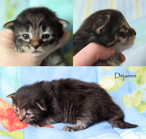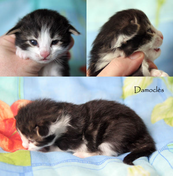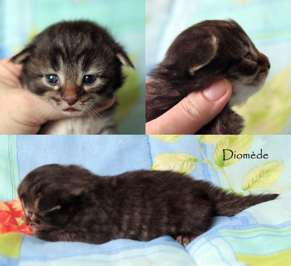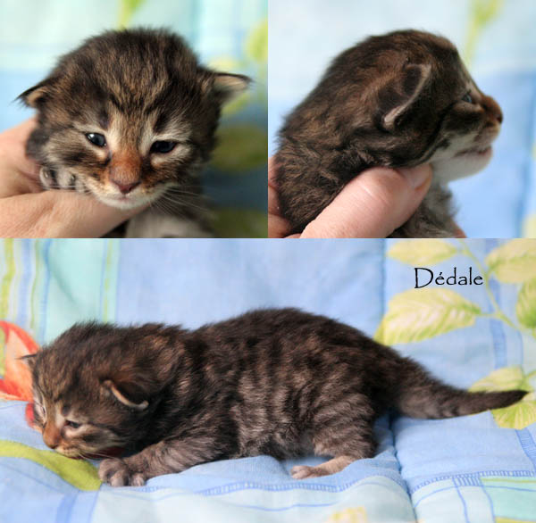 | Déjanire | femelle | black mackerell tabby (n 23) | Danaé | femelle | black silver mackerell tabby (ns 23) | Dryas | mâle | black silver mackerell tabby (ns 23) | Diomède | mâle | black mackerell tabby (n 23) | Dédale | mâle | black mackerell tabby (n 23) | Damoclès | mâle | black blotched tabby & blanc (n 09 22) |