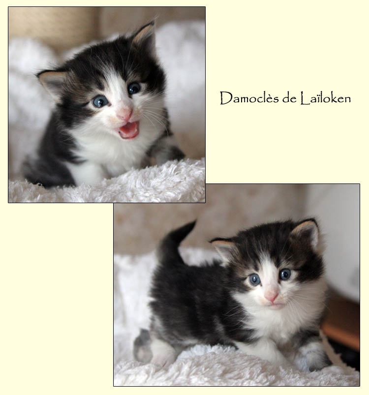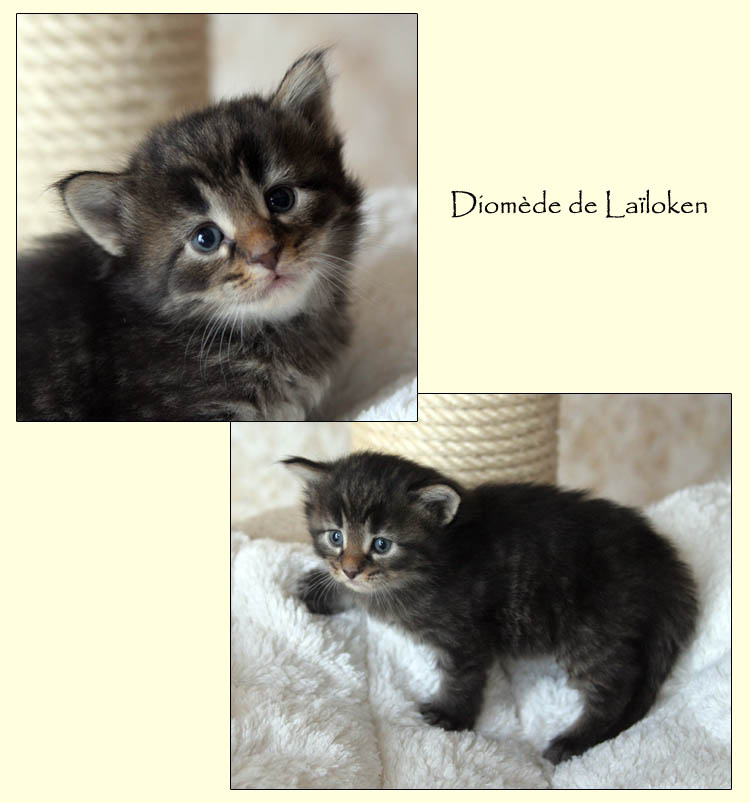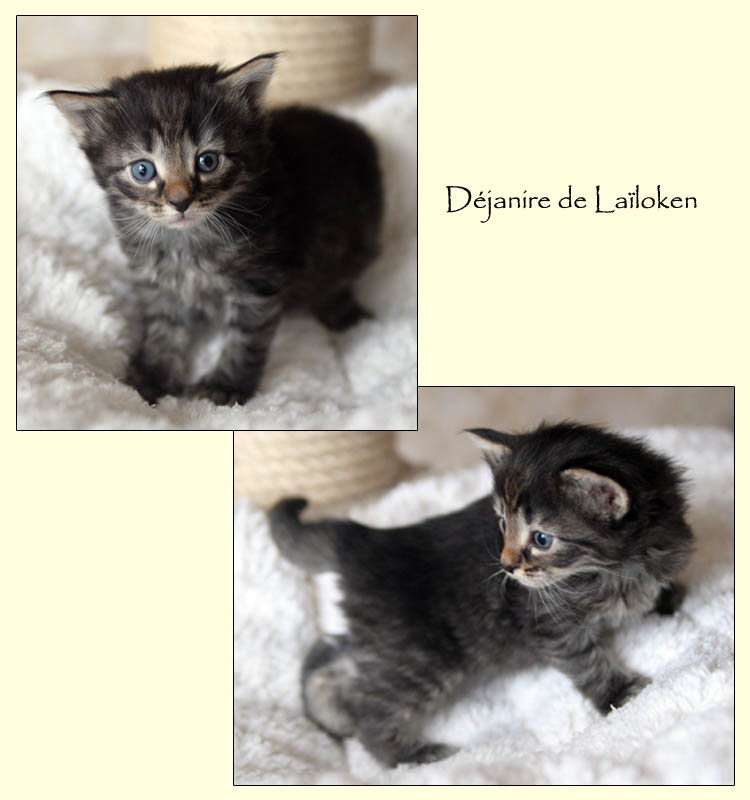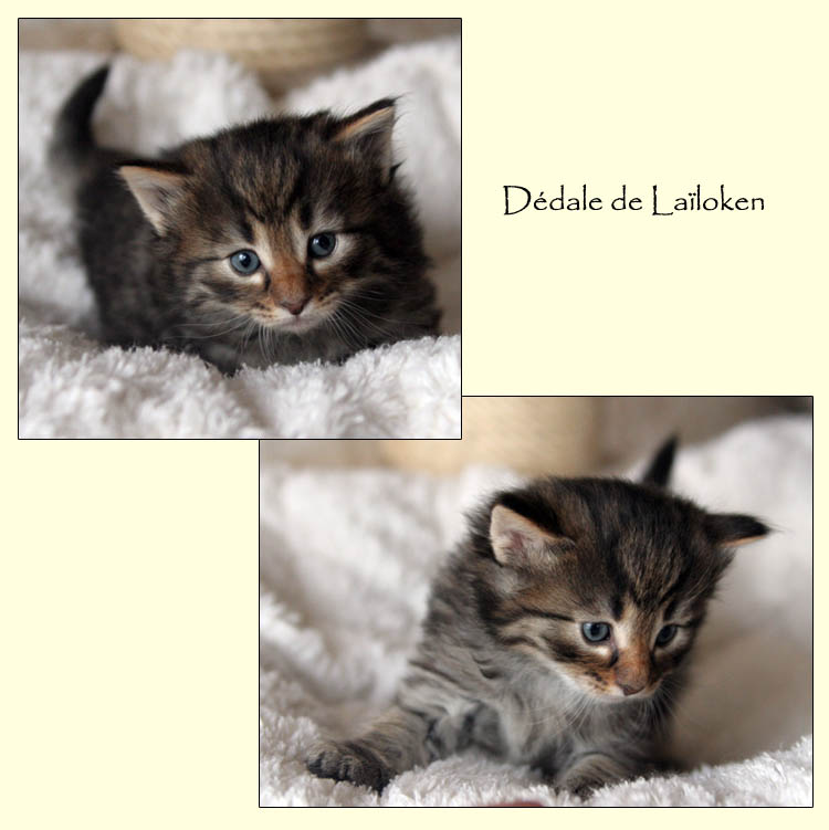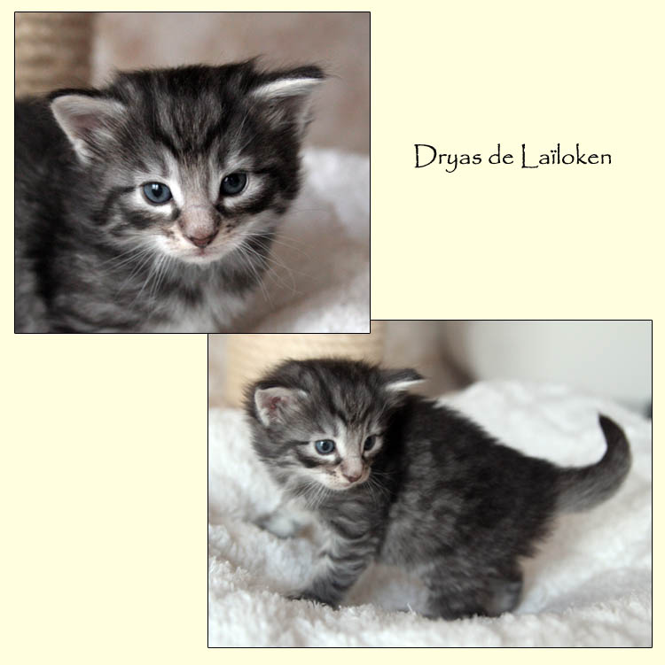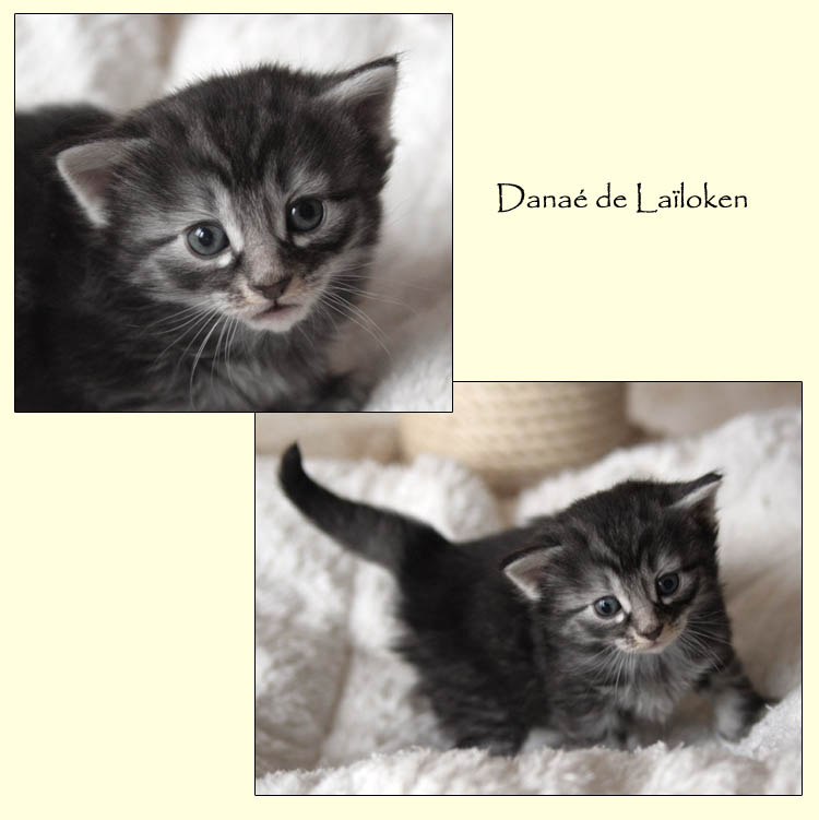 | Déjanire | femelle | black mackerell tabby (n 23) | Danaé | femelle | black silver mackerell tabby (ns 23) | Dryas | mâle | black silver mackerell tabby (ns 23) | Diomède | mâle | black mackerell tabby (n 23) | Dédale | mâle | black mackerell tabby (n 23) | Damoclès | mâle | black blotched tabby & blanc (n 09 22) |