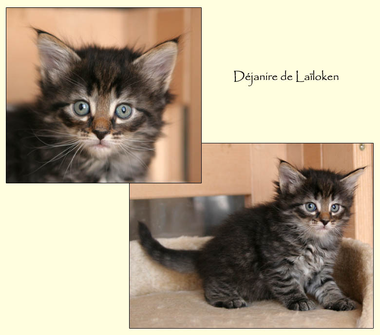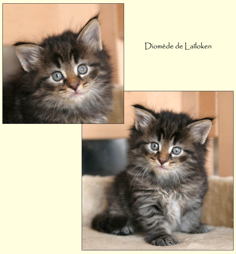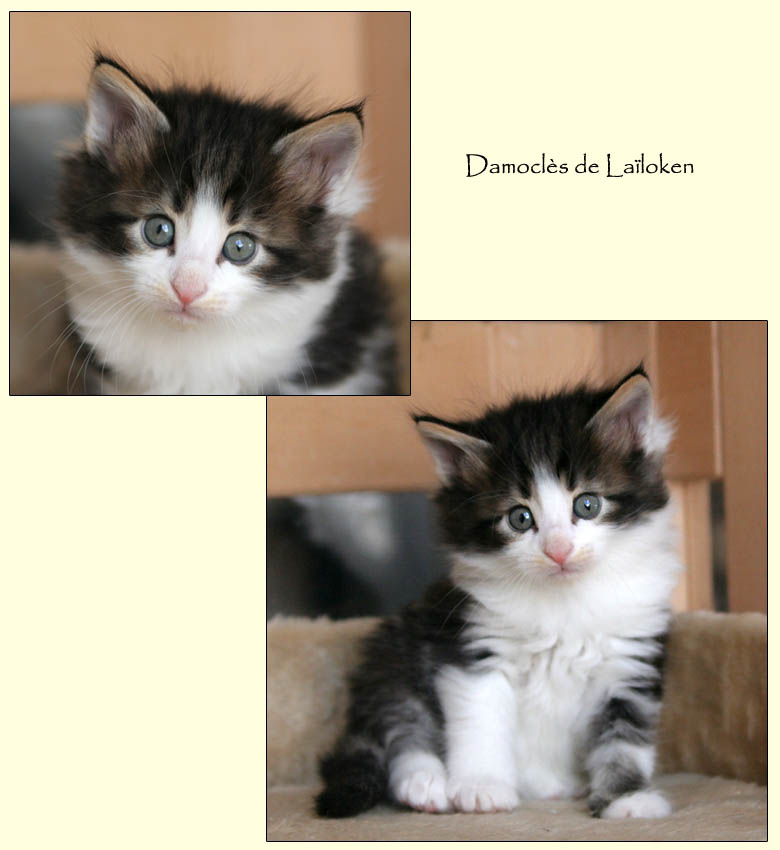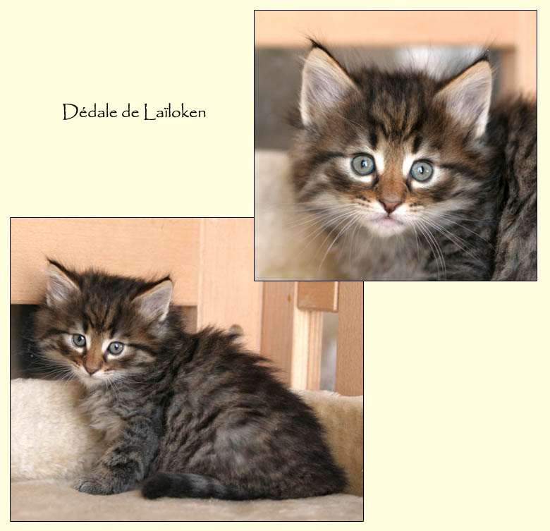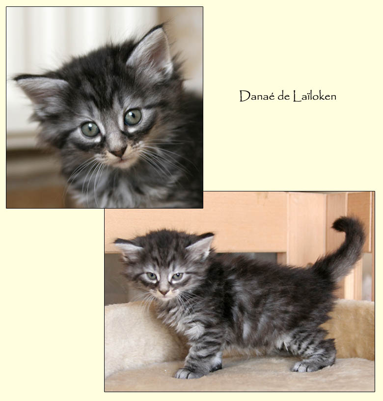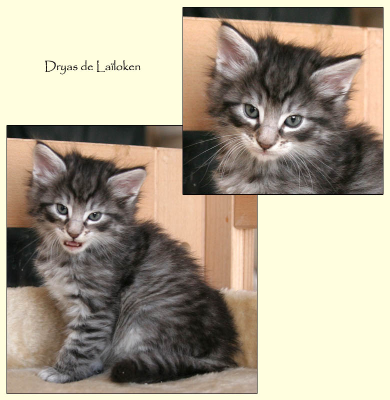 | Déjanire | femelle | black mackerell tabby (n 23) | Danaé | femelle | black silver mackerell tabby (ns 23) | Dryas | mâle | black silver mackerell tabby (ns 23) | Diomède | mâle | black mackerell tabby (n 23) | Dédale | mâle | black mackerell tabby (n 23) | Damoclès | mâle | black blotched tabby & blanc (n 09 22) |