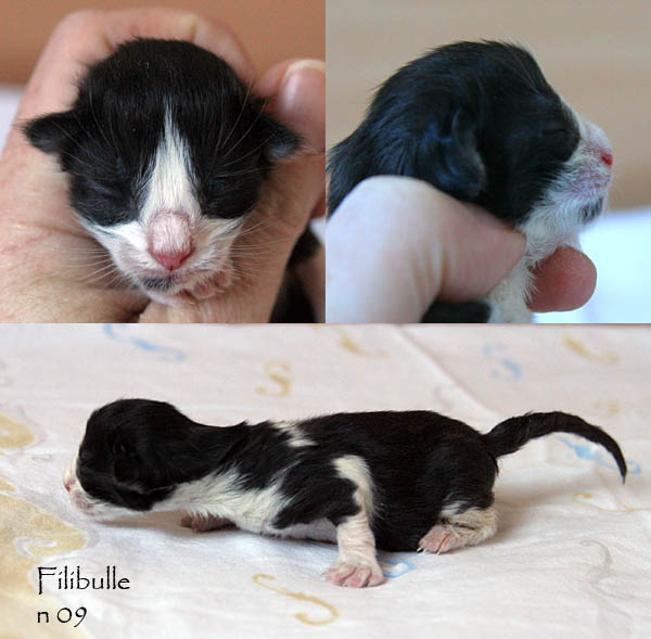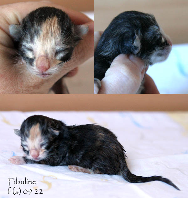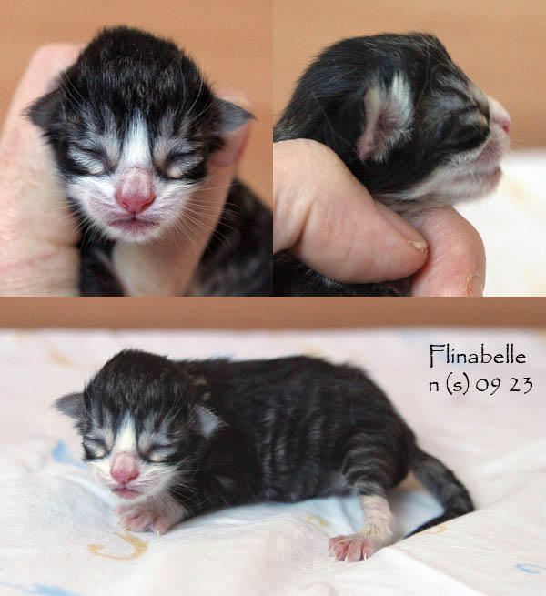 | Fibuline | female | silver blotched tortie & white (fs 09 22) | Filibulle | female | black & white (0 09) | Flinabelle | female | brown mackerell tabby & white (n 09 23) |