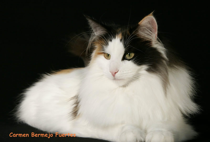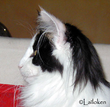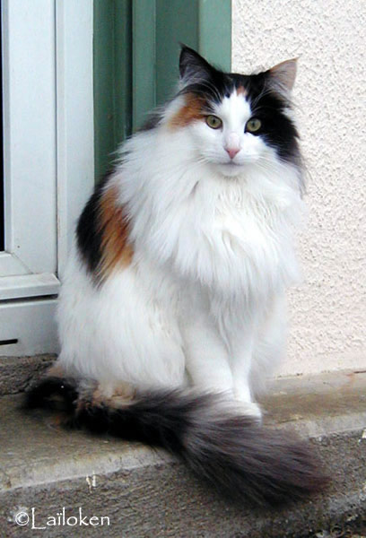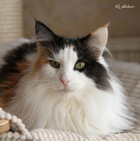 | Vivian est issue de la deuxième portée de Korsaire. La garder à la maison ne faisait pas partie des plans mais.... je suis complètement tombée sous son charme! Vivian a hérité des qualités de ses deux parents: un triangle impeccable, de très belles oreilles à plumets bien placées, un corps solide et long et une belle qualité de poil.... et détail non négligeable, un excellent profil terminé par un joli front haut et bien arrondi. Avec ce charisme, cette expression éveillée très "norvégienne" qui caractérisent la lignée de Korsaire, et dans l'oeil cette lueur malicieuse et ce caractère absolument adorable qui sont l'apanage de sa maman Angel. Raymond Saetre l'a qualifiée de "Diva" lors du NFO Worldshow 2006 au Danemark... ce qui résume très bien son charisme et son formidable caractère de Top Show. Vivian, au fil des années, a démontré outre son tempérament de showcat, ses qualités de chatte d'élevage. Comme sa propre mère Angel, Vivian reçoit en 2013 le titre de DM: Distinguished Merit Fife. Elle est présente dans de très nombreux pedigrees de chats en Europe à travers son importante et magnifique descendance, via en particulier sa fille Audrey Hepburn de Laïloken (chatterie des Iles Lofoten), et son fils Dancing Lord de Laïloken. Vivian est la reine de la chatterie, la plus belle représentante de mon élevage. Particulièrement attachante, Vivian désormais stérilisée coule une retraite heureuse à mes côtés et elle garde cette prestance et ce regard qui font d'elle un chat à part . |
