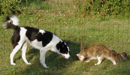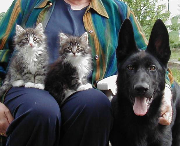 Voici Look, border collie, et Urane, Berger allemand noir, les deux chiens de la famille qui vivent chez mes parents. Les deux chiens rendent souvent visite aux chats qui y sont parfaitement habitués. Nous présentons aussi les chiens aux chatons afin qu'ils connaissent cette espèce. |